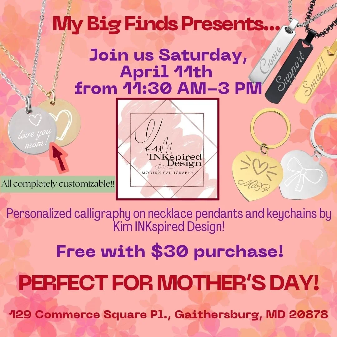 She’s back! We’re so excited to welcome Kim from Kim INKspired Design for a special pop-up on Saturday, April 11th from 11:30 AM to 3 PM! She’ll be engraving beautiful custom calligraphy on necklace pendants and keychains, making the perfect personalized gift for Mother’s Day (or any occasion 💕).